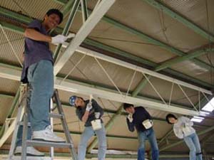 頼もしいペンキ塗りの助っ人に支えられて、着々とでき上がる母屋=静岡県富士宮市の自宅