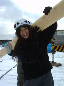到着したコンテナからログ材を、大勢の仲間とともに運び込む山村さん。「この重みがうれしい!」=平成16年1月24日、静岡県富士宮市の自宅