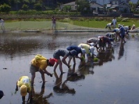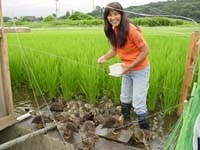 そんな時、「共同でやる田圃があるんだけれど、一緒にお米やってみる?」と、郵便局員のY氏から話を持ちかけられました。兼業農家のY氏は、「富士山麓アイガモ農法の会」の人で、いつもにこにこしながら「やってみなきゃ分かんにゃー」と、何事にも前向きで冒険心のある人でした。その人柄にも惚れて、2000年の田植えに参加してみると、仲間もみんな濃い人たちばかりです。長年オーガニックでお茶や野菜や卵を生産している農家たち、そして農業をまったく経験したことのない会社員の人たちが十数名ほど集まっていました。酉年で動物好きの私には、アイガモの存在も実に魅力的でした。