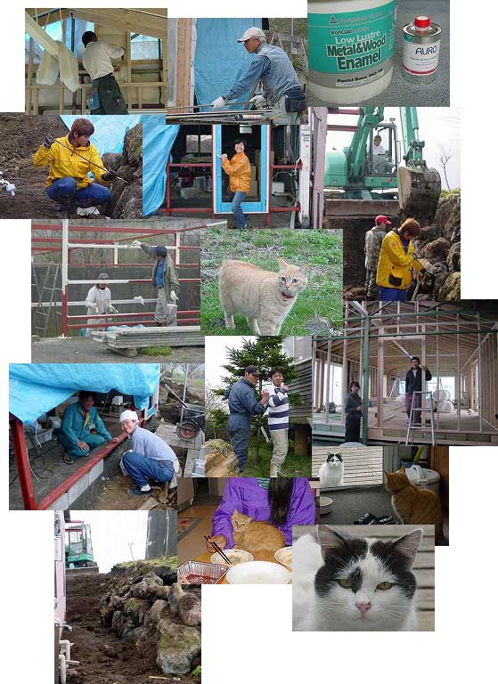 4月5日 、スタッフのアキちゃんの本日の課題は「巨石移動」。40トンの水タンク脇を整地するも、どうしてもガンだったのが、ちゅうと半端な溶岩の巨石くん。とってよいものか、やるだけ無駄なものか、しばし思案。けれどそれは、あっという間に取り去られたのでした。バンザイ! 大工の藤間さんは壁内側製作。その横、ガレージ部分は台所に変身中。