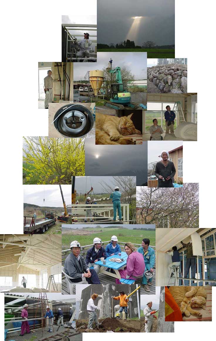4月2日も、山場がやってきました。いつもいつも山場という気もしますが、大勢の友人が「助っ人」に来てくれたのでした。で、ミスター・バイクの編集員の梶川真理子ちゃん(のちにスタッフに!)も、スタッフのはんちゃんの旦那様のまさみっちゃんも、また来てくれた。忙しい中でしょうが、「楽しい!」を連発してくれるので、助かります。そんなお助けマン&ウーマンが賑わう中、プロの大工さんと鍛冶屋さんも着々と作業を進めていました。この日、母屋の外壁張りは半分が終わり、急遽工事を依頼したガレージの屋根づくりの基礎も進みました。雨漏りも我慢の限界で、とうとう「三与建設」さんの登場。鉄骨でばしーんと骨組み作って、せっぱんで屋根つけて、母屋から取ったシャッター移動して、ドアもきちんとつけて・・・農業用の作業小屋とバイク作業小屋が出来る予定です。
