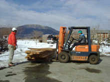 | 現場仕事、大好きのレイコ。いくつになっても“風より元気!!”さあ、みんな、ログ搬入2日目の27日もガンバロー!!! |