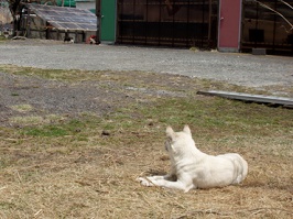 3/26の朝霧です。ウランの背中の向こうにある茶色の固まりは、、、久し振り登場、猫の「らん」で〜す。ひなたぼっこしてます。