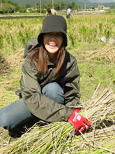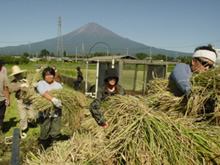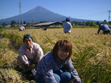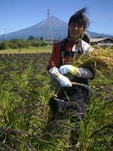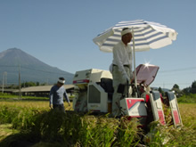 | 風が強く、後ろの富士山では大沢崩れから土煙が上がっていました。レイコは久しぶりの田んぼ仕事が嬉しくて、バリバリと音をたてて稲刈りをしていました。ちょっと手を休めてもらってのショット。 |