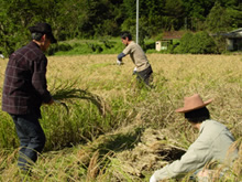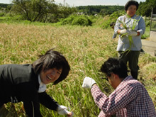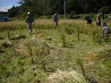 古代米各種も混じらないように刈らなければイケマセン。手前が赤米担当・西村さん、左が埼玉産・黒米担当・奥野さん、奥が黒米選別中・チームターザンの萩ちゃん。 |