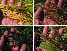 左上が香り米2種、右上が赤米、左下が緑米(今回は刈っていません)、右下が埼玉の友人からもらった黒米。ありが稲の黒米は丸いモミですが、こちらは長細いです。