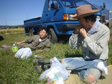 正しい労働には正しい休憩が必要です。カウボーイハットは、掛川から来てくれた西村さん。草むらで幸せそうなのは、田んぼメイトの岡ちゃん。バイク屋さん(モトスラン 0544-23-3093 ヨロチク)を休んでの援農。いつもありがとね。 |