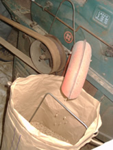 ドラムの中で稲から外されたモミが、ここから出てきます。煙突の途中でつっかえたり、隙間から出てくる量が多かったりするのはご愛敬? |
