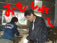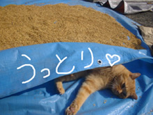 夜勤明けで帰ってきたばかりなのに、子供のように大喜びで脱穀するまさみっちゃん。その横でニコニコとワラを束ねるはんちゃん。ふふ、農業夫婦への道、着実に。 |