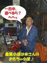 | 自分で建てた農業小屋で、色んな機械をいじくる米山師匠。今回の脱穀機も自分で修理。農業も機械いじりもとっても楽しそう。見ている方もとっても楽しくなります。 |