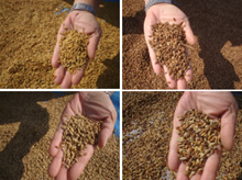 (左上)宮崎でレイコがもらったタイ原産の香り米。(右上)埼玉の小林さんからもらった香り米。(左下)同じく埼玉産、赤米。一番収穫量が多かった。(右下)全部混じったブレンド米。きれい〜。 |
