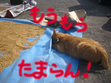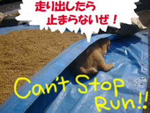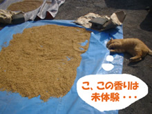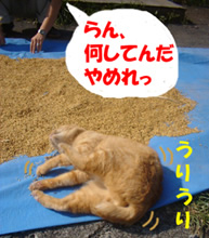 種類ごとに広げてモミを乾かしていると、普段はお米に見向きもしないらんが、香り米(タイ原産)ゾーンにやって来て、突然! |
