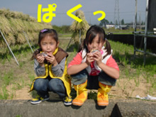 仲良くおやつをほおばる米山師匠のお孫さんと、横浜から駆けつけてくれた新田遥ちゃん。田んぼでおやつのCM撮りもいいと思うぞ。 |