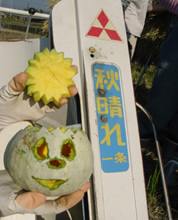 | 本日の人気者・一条刈り稲刈り機「秋晴れ」君と、奥野さんがその場で作ってくれたハロウィーンかぼちゃ。奥野さんって、器用ね〜♪ |