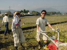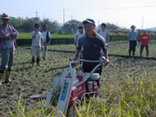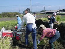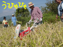 とってもとっても働き者の増田夫妻は、静岡市から参加。ヒエ取りから農作業に取り憑かれたか? ただ今、旦那さんが真剣に稲刈り機中。 |