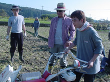 | 手刈りと同時に、米山師匠の稲刈り機が出動。途中でキャブが詰まったりしたのはご愛敬。「わはは、やっぱ使ってないとダメだら」 |