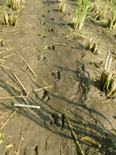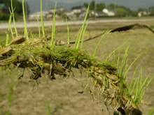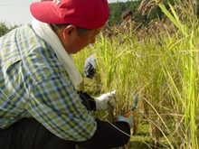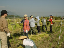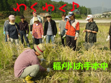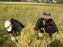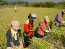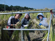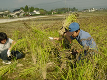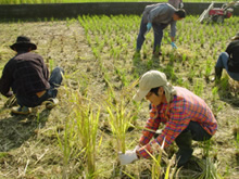 | 連休中日の11月2日はスキッとした青空が広がりました。なんて素晴らしき稲刈り日和でしょう。レイコは残念ながら仕事のため欠席ですが、前日からの宿泊組を含め、計30人もの人が援農に来てくれました。 本日のメニューは「約0.8反の緑米&黒米稲刈り」です。前回の稲刈りで残った黒米と緑米を刈り取り、すべて天日干しにします。全員カマを持ちましたか? いいですね。さあ、思う存分お刈り下さい!! ザクザク。心地いい音が響きます。「なんか快感」「気持ちいいね〜」「お米作ってるって、感じ」初めての人もそうでない人も、収穫の楽しさを感じているようです。自然とニコニコしながら作業しています。ふふふ、自然農をやるほど、手作業があるほど、みんなでやるほど、農作業って楽しいんですね。 さてさて、今年最後のビッグ援農イベントである「黒米稲刈り」の中で、もっとも大ウケだったのが「一条稲刈り機体験」でした。この一条稲刈り機は、お米の師匠・米山さんが昔使っていた物だそうです。一条(稲の一列のこと)ずつ稲を刈り、自動に紐で束ねてくれる機械です。現代は、稲刈り→脱穀(稲から穂を取る)→籾を袋に入れる→ワラを細かく刻むという作業を一気にやるコンバインが主流ですが、それ以前の稲刈りはこのタイプの稲刈り機が活躍していたのです。ガッチャンガッチャンと機械のカマが稲を刈り、ガチャンっと紐で結んだ稲束が出来上がります。 最初は米山師匠が刈り、次に田んぼ部長・まさみっちゃんが、そして「やってみたーい」と菊地由花ちゃん(お馴染みチームターザンの一員)が名乗りを上げました。お、やってみなはれ。「これがバックで、これが刈り取りで・・・」米山師匠が説明します。「はい、わかりました。行きま〜す♪」元気な声です。さあ、どう・・・・・・え、あの、おいおい、ぎゃあ〜! 機械はゆっくりと進んでいるのですが、まったく刈れていません。稲は倒れてゆくばかり。「真っ直ぐ進まない〜!」「あれ? 刈れない、ええ!」由花ちゃんが叫びます。米山さんが駆け寄って、また説明します。さあ、今度はどうでしょう・・・ぎゃああ〜! そっちは違うぅぅ。本人は真剣、でも回りは大笑いです。 そうして、みんなして順番に稲刈り機体験が始まりました。スゴク慎重に進む人、結構アバウトにやってしまう人、いきなり上手に刈れる人、同じ機械なのに個性が出るのが面白いところです。手刈りも面白いけれど、この人間的な機械もムチャ面白い。 大ウケだった稲刈り機のお陰もあって、昼の2時過ぎには作業全て終了です。疲労度も少なく、みんなの顔は満足げにニコニコです。「2台くらいで競争したら面白いな」とは、同じく稲刈り機にハマった田んぼ部長。うん、それホント面白そう! 来年は赤組、白組に分かれて「稲刈り運動会」やりますか!! (いすわりまりこ)
