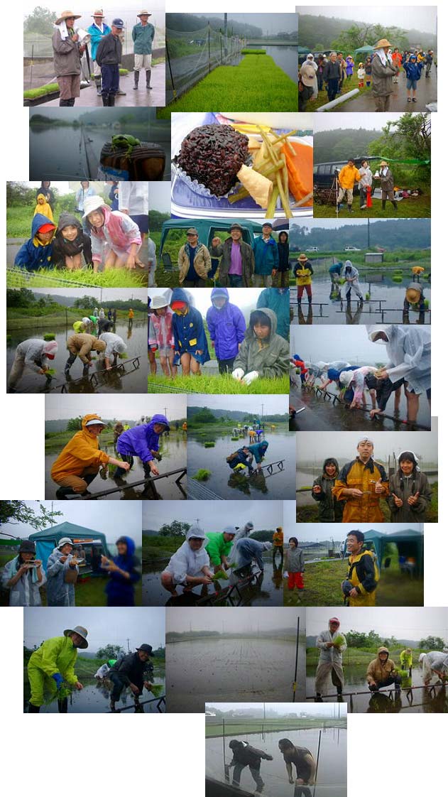 | いやぁ、それにしても、大変よく降りました。台風の影響で、どーなることかと思っていた今回の「田植えDAY」。金曜日にはその心配も通り過ぎ、「こりゃ、台風一過で、どぴーかん間違いなしだぁ!」なんて安心してたら、なんのなんの・・・。 当日の5月23日(日)は朝からどしゃ降りの大雨。そんな、悪天候ではありましたが、富士宮市下条にある3.3反のレイコ田んぼの田植えが無事終わりました。この日、援農に集まってくれた約50人の皆様、本当に本当にありがとうございました!すべての田植えを終えることはできませんでしたが、一人一人の手で植えて頂いたレイコ米、きっとしっかりと根を落ち着かせることでしょう。そして秋まで、合鴨ちゃん達に見守られ、たわわに実ったこの田んぼで、再び皆さんの笑顔に出会えることを心より楽しみにしています。みんなー、祈っててくださいねー!!! (レイコ&フェアリーテール一同)