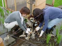 それがさ、あの「ピーピー・ピーピー」ちっこいのが来てから風向きが変わっちゃったのよねぇ・・・( ̄^ ̄) なーんか、あたしの頭の上に細い糸はりめぐされちゃったしぃ〜・・(>_<) あ〜うざったい!大っきなお空見たぁ〜い!!!あのうちわみたいなパタパタ足で動き回って、あたし達の水もいいあんばいにかきまぜられてきんもちい〜し、よそもんの草やら、虫やら食ってくれるし、おしりからでるピチョピチョうんちであたしら元気になるし、あっ!なんだ〜、いい事ずくめじゃん!わーいわーい!!(^0^)/ でも、納得いかないのよねぇ( ̄〜 ̄)ξ けっ!カモばっかりかまってよぉー!!もぉーぬけてやるー!はげてやるぅー!(`´) レイコ「あ〜ん、そんなにおこるなよ〜!毛はえ薬買ってあげるからぁ〜(^O^) あっ!だめだぁ〜、ここは無NO薬の田んぼだったんだぁ〜(>_<)」 チャンチャン♪
