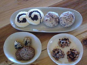 クッキーの上は「黒米モチ」。炊いた黒米をプチプチ感が残るぐらいについてキビ砂糖を混ぜ、ゴマときな粉をまぶしたもの2種類。冷めても固くならないのはグッドだけど、本番では甘みが足りなかったな。蒸し→つくの、ちゃんとお餅として作る方が美味しいかも。