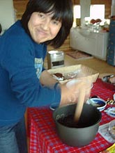 | いつも美味しいスコーンを作ってくれる清美ちゃんが、今回も大活躍。粉は「スコーンの素」を使いますが、バターは420gで1200円の最高級品を使用。まずは材料(粉、バター、牛乳、卵)を混ぜて冷蔵庫で20分ほど寝かせます。 |