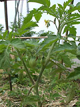 茄子は元気のない子もいますが・・・こちら支柱に捕まりテッペン目指して成長中。茄子とトマトとバジル・・・大好きな組み合わせ!美味しく食べようね。 |