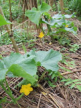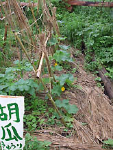 胡瓜達もやっと支柱に捕まって。もっといけ〜。花が咲いてくると、その後追って実が付き始めます。 |