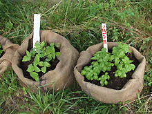 近所の宮島のおばあちゃんのアドバイスを受け、カカオ豆の袋を利用してバジルとシカクマメ植えました。青見牧場さんからのカフェオープン祝いに頂きました。 |